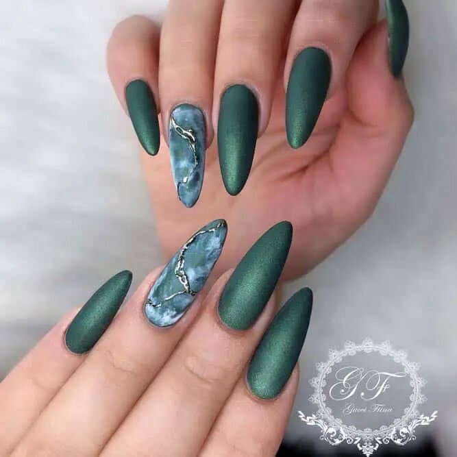 Мармуровий дизайн зазвичай асоціюється з глянцевим покриттям, але ви можете зробити чудовий матовий смарагдовий манікюр із димчастими розводами на акцентних нігтях.