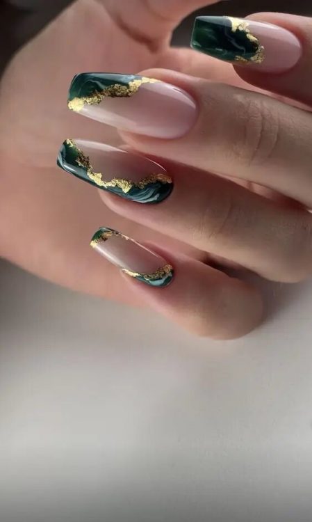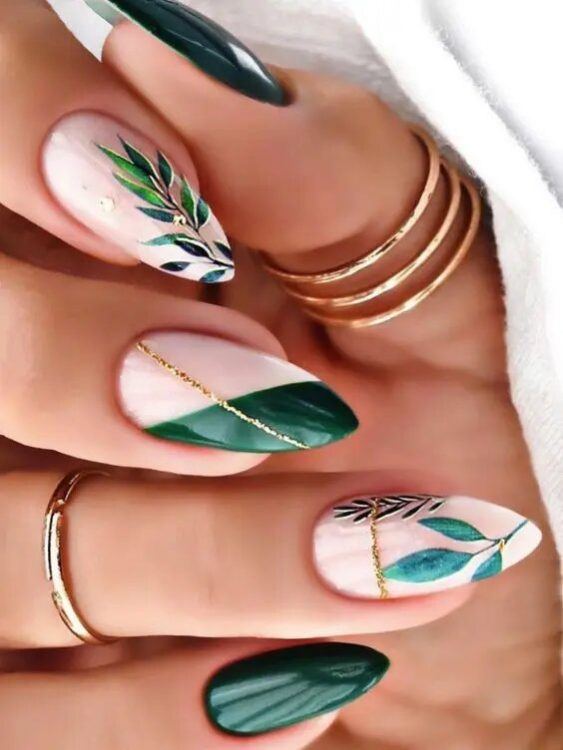 Якщо ви любите природу і хочете продемонструвати це у своєму манікюрі, використовуючи рослинні мотиви, цей дизайн для вас. Листя смарагдово-зеленого кольору в поєднанні із золотим декором нагадує дорогоцінне каміння.