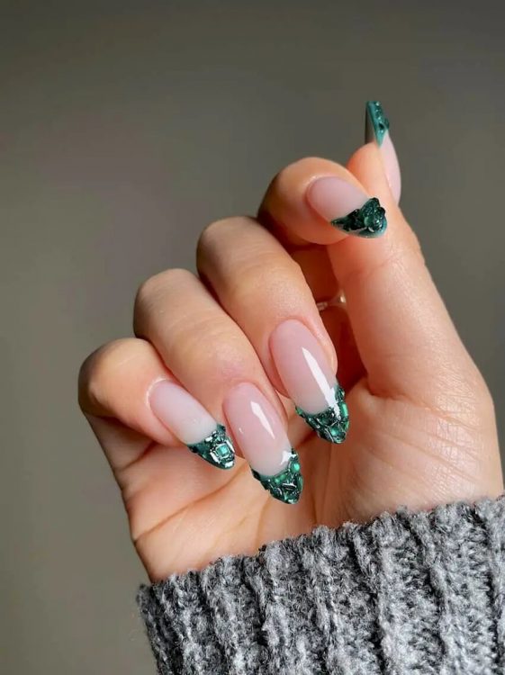 Цей манікюр є черговою варіацією класичного френчу. Замість традиційних білих смужок кінчики нігтів прикрашені об’ємними смарагдовими стразами.