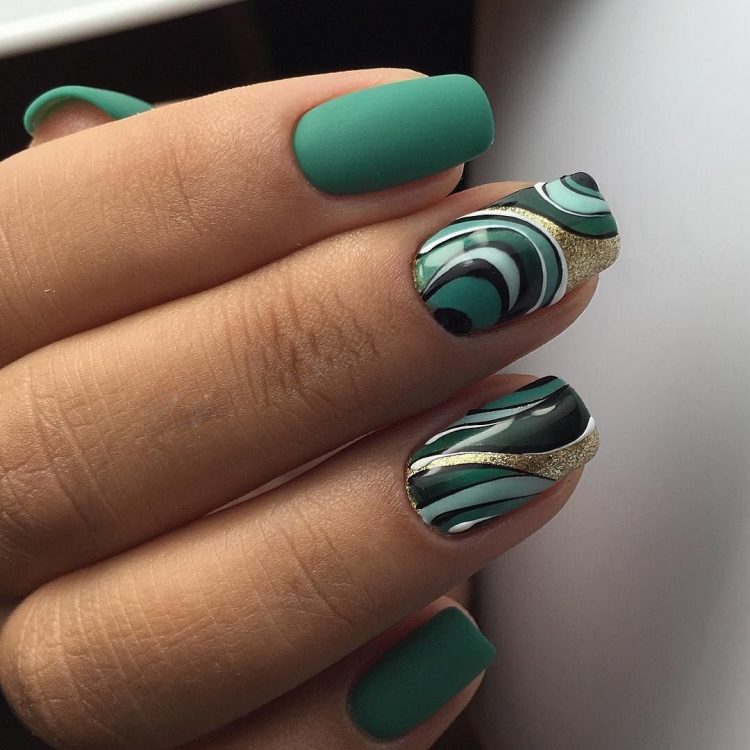 Щоб створити мінімалістичний, але оригінальний абстрактний нейл-арт, спробуйте намалювати химерні лінії, використовуючи різні відтінки смарагдово-зеленої палітри та золотистий блиск.
