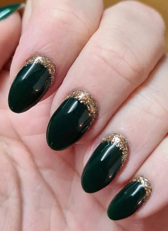 Замість того, щоб у черговий раз робити традиційний френч, спробуйте зворотний ефект – виділіть іншим кольором основи нігтів. Для надання блиску та контрасту використовуйте блискучий лак. Це чудовий варіант смарагдового манікюру для свята чи вечірки.