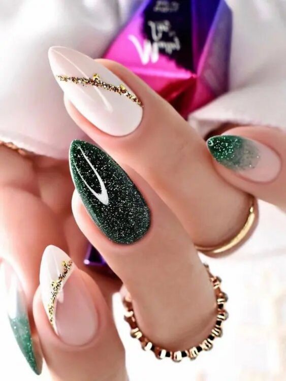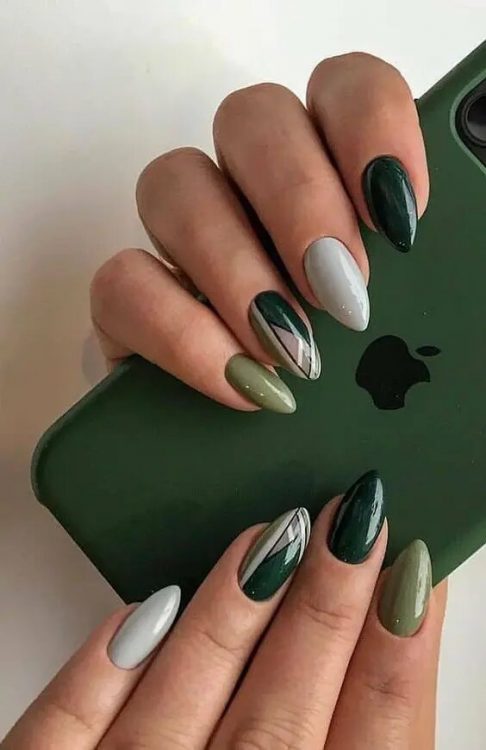 Якщо ви шукаєте ультрамодний та сучасний варіант смарагдового манікюру, вам сподобається цей геометричний дизайн нігтів. У ньому також використовуються інші відтінки зеленого та ніжного молочного кольору.