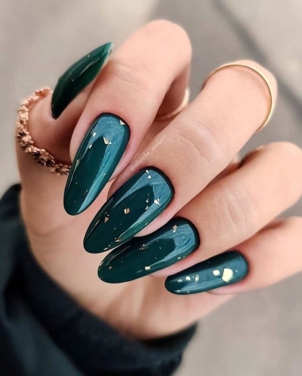 Ще один мінімалістичний смарагдовий манікюр – це витончений дизайн з крихітним золотим листям. Листочки настільки малі, що практично не “кидаються” у вічі, але при цьому служать цікавим акцентом.