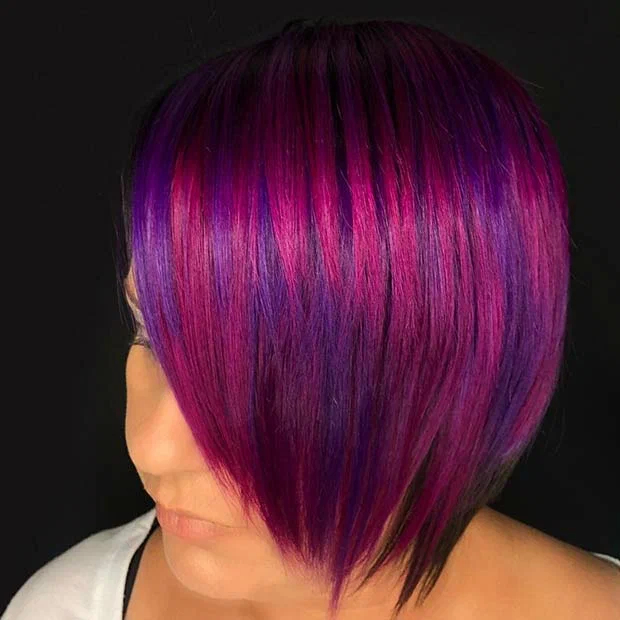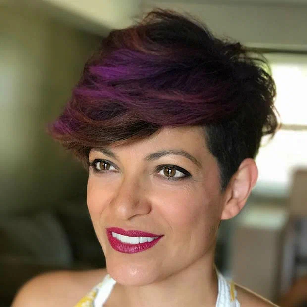 Стрижка «піксі» з подовженим чубчиком + виразне забарвлення з акцентним чубчиком фіолетового кольору – модний тренд, який додасть впевненості у собі жінці будь-якого вікового діапазону.