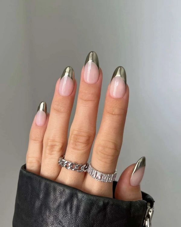 У металізованому покритті завжди є щось привабливе. Футуристичний блиск робить манікюр вишуканішим, а крижаний оливково-зелений колір лаку чудово поєднується з будь-яким образом.