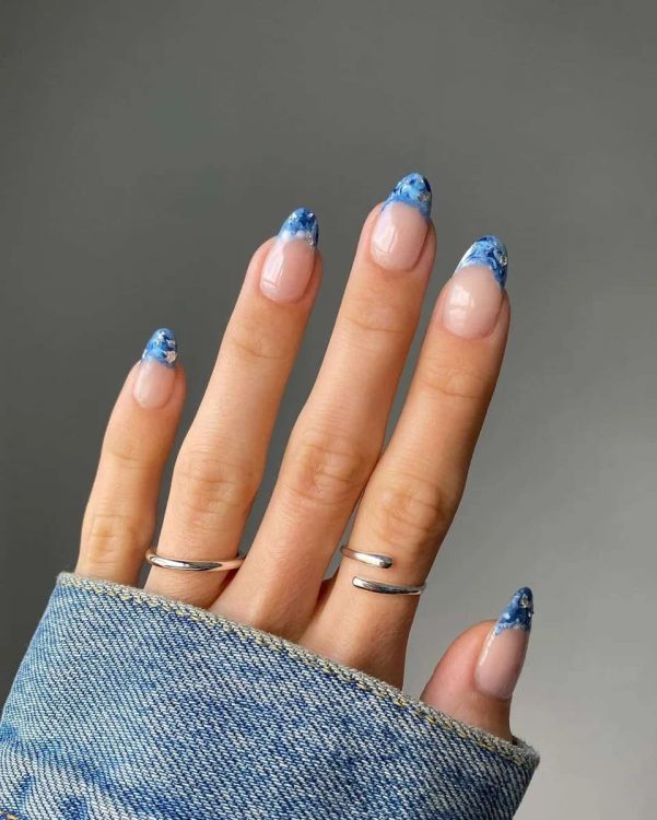 У цьому геометричному французькому манікюрі є певна чарівність. Строга симетрія чудово поєднується з ніжною палітрою кольорів. Базовий білий колір повністю обрамляє кінчики нігтів, але з одного боку його доповнюють сині та блакитні смужки, які роблять дизайн яскравішим.
