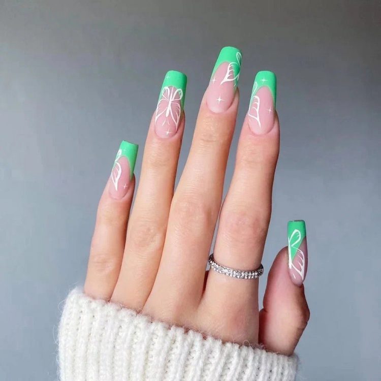 У цьому варіанті французького манікюру є якесь диво, яке привносить витончений метелик, що ніби перелітає з одного нігтя на інший. Яскраво-зелений, майже неоновий відтінок освіжає образ і додає нотки весни.