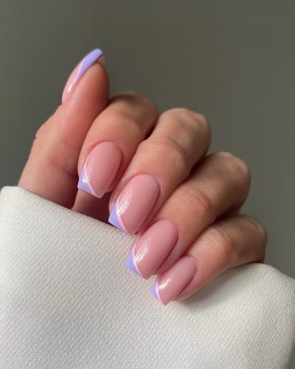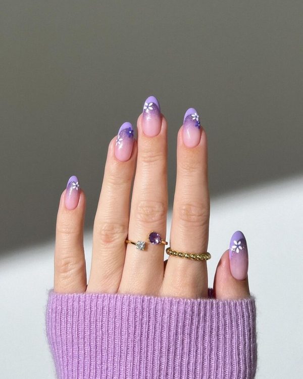 Фіолетовий – ще один трендовий колір, який добре поєднуватиметься з весняними образами. Щоб урізноманітнити вигляд лінії на кінчику нігтів, додайте квітковий декор або зробіть дугу косою.