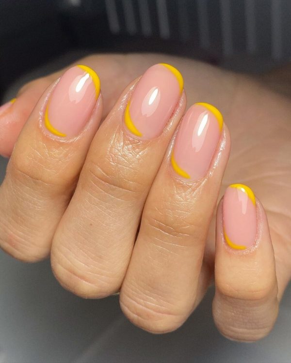 Тим, кому не вистачає тепла, рекомендуємо зробити манікюр із сонячним кольором — жовтим. Щоб нейл-арт вийшов по-справжньому небанальним, додайте квітковий дизайн або ще одну посмішку біля нігтя — «зворотний» френч готовий.