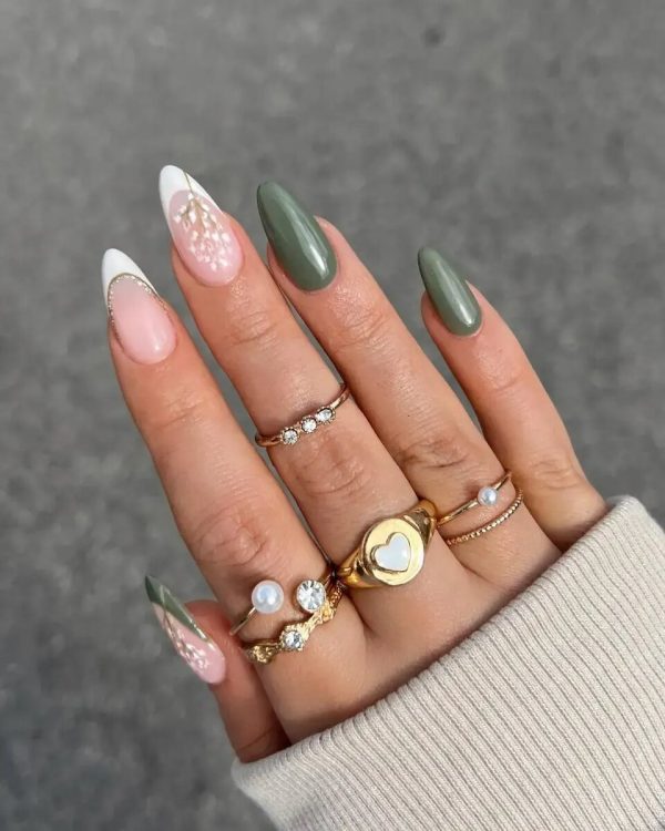 Створіть яскравий образ за допомогою рожево-зеленого асиметричного французького манікюру. Тут в якості основного відтінку виступає м’ятно-зелений, а нігті на середніх і безіменних пальцях виділені блідо-рожевим кольором і прикрашені зеленими асиметричними кінчиками, обрамленими золотом для надання елегантності.