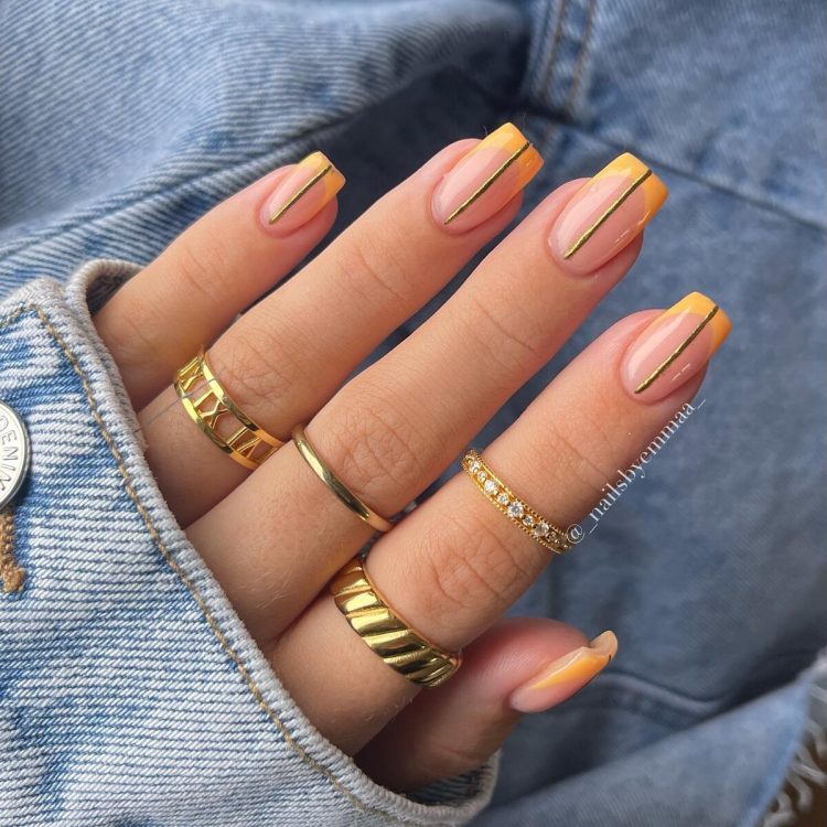 У цьому манікюрі нігті прикрашені яскравими помаранчевими кінчиками та вертикальними прямими лініями, що проходять через центр, що надає класичному френчу більш сучасного та стильного вигляду.