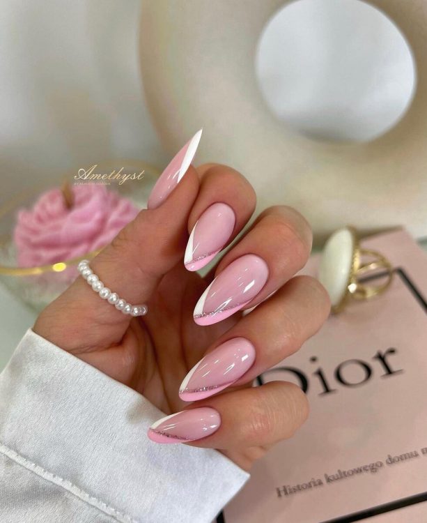 Цей дизайн – данина елегантності та вишуканості. У ньому світло-рожевий і білий кольори поєднуються в унікальних французьких кінчиках V-подібної форми, які виглядають витончено і модно одночасно. Делікатні акценти з рожевого золота додають розкоші, завдяки чому кожен ніготь виглядає як майстерно виконаний ювелірний виріб. Це чудовий вибір для тих, хто шукає ідею скромного, але вражаючого манікюру.