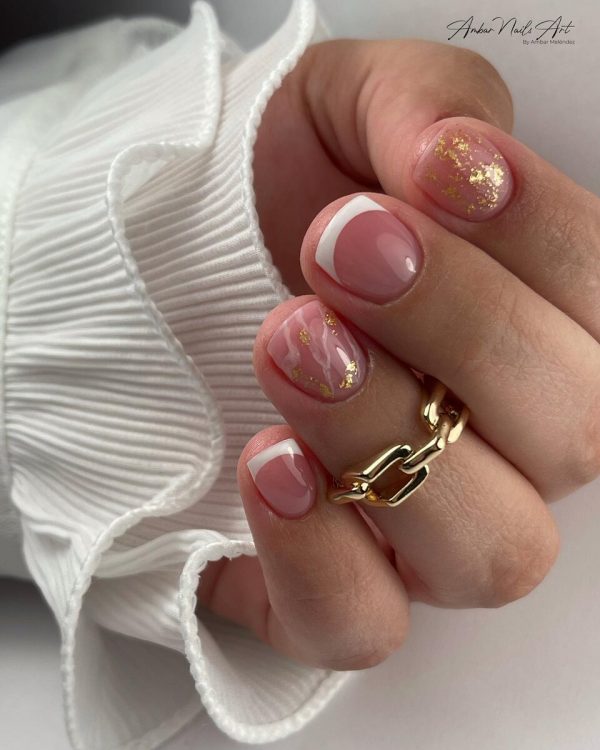 Поєднуючи в собі чистоту білого та розкіш золотого, цей дизайн є втіленням елегантності. Він ідеально підійде тим, хто віддає перевагу невеликій довжині нігтів і обожнює класичний френч. Додавання золотих блискіток надає нотку гламуру та свята, що робить цей манікюр чудовим вибором для особливих випадків.