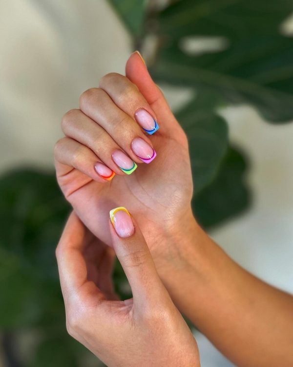 Цей манікюр вкотре доводить, що гарний дизайн не завжди потребує великої довжини нігтів. Подвійний різнокольоровий френч цілком підійде володаркам коротких нігтів. Він універсальний і завжди виглядає просто чудово.