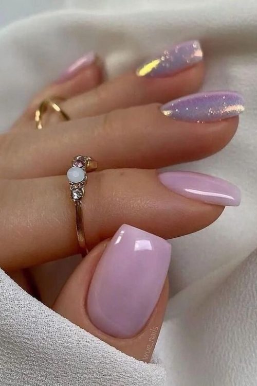 Цей манікюр виглядає просто, але гламурно завдяки мерехтливому шиммеру. Три нігті на кожній руці покриті глянсовим бузковим лаком, а два інших – мерехтливим фіолетовим лаком, що переливається золотим блиском на світлі.