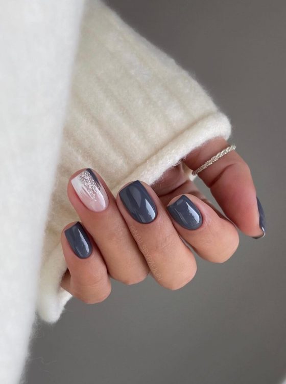 Сірий – це ідеальний відтінок для зими. Покрийте їм усі нігті, крім акцентних на безіменних пальцях. Для них виберіть білу напівпрозору основу, прикрашену легкими мазками сірого, сріблястого та білого кольору.