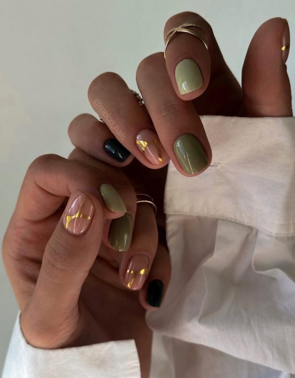 Використовуйте ніжне поєднання приглушеного зеленого та нюдового кольору, щоб створити привабливий манікюр на коротких нігтях. Щоб надати дизайну розкоші та динамічності, прикрасьте нюдову основу золотими акцентами.