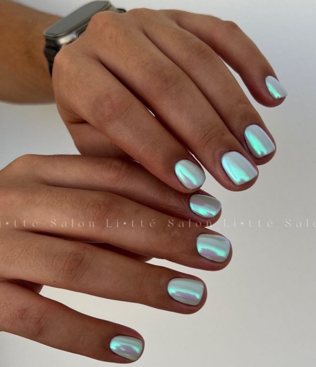 Перлинний лак, що переливається, – один з кращих способів надати привабливого вигляду нігтям невеликої довжини. Кожен ніготь у цьому манікюрі покритий однотонним лаком, що створює гарну гру синіх та фіолетових тонів на світлі.