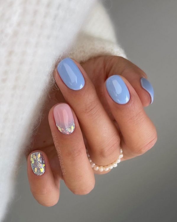 Цей манікюр ідеально підходить для зимових місяців завдяки своїй крижаній палітрі кольорів. Три нігті на кожній руці пофарбовані у світло-блакитний відтінок, нігті на безіменних пальцях мають рожеву основу та прикрашені блискітками, а нігті на мізинцях повністю вкриті крижаними синіми та золотими блискітками.
