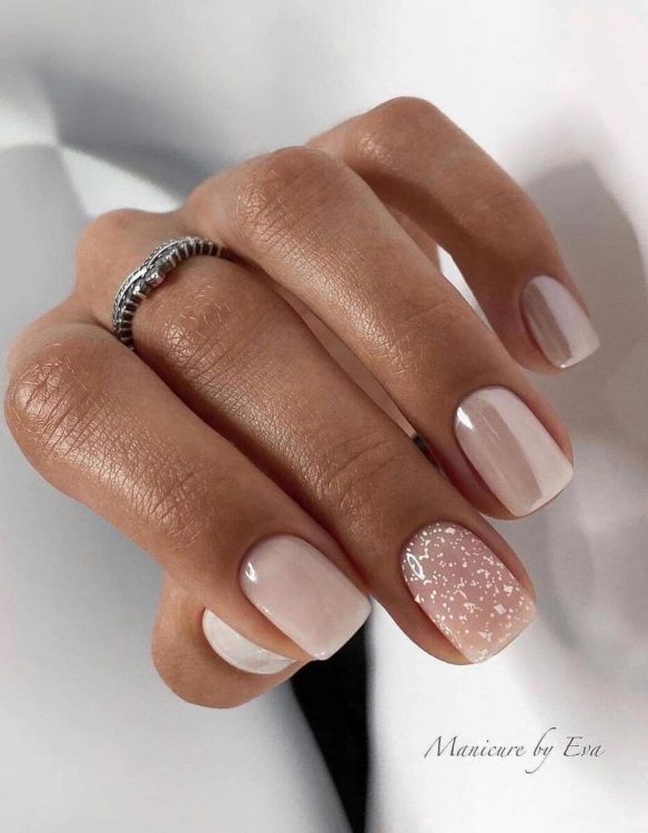 Нейтральні відтінки завжди виглядають на нігтях максимально жіночно та вишукано. Для цього манікюру обрали мерехтливий блідо-рожевий відтінок. Акцентні нігті прикрашені дрібними сяючими срібними цятками.