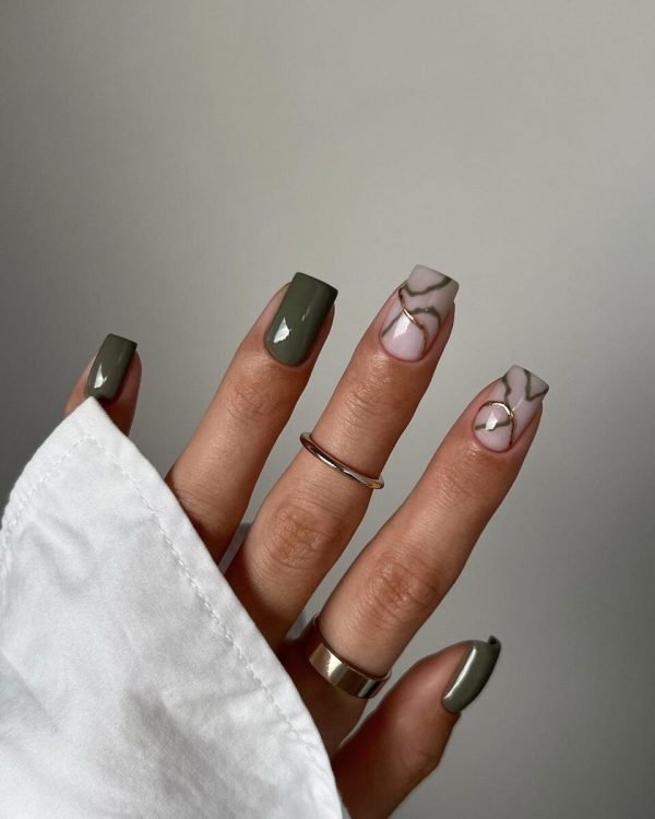 У цьому манікюрі три нігті на кожній руці пофарбовані в глибокий зелений відтінок, а нігті на вказівних та середніх пальцях мають білу основу та прикрашені оливково-зеленими та золотими лініями, які схожі на тріщини.