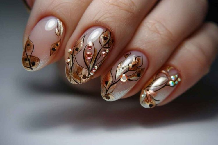 - «Ювелірний» декор виграшно виділятиметься на нейтральній нюдовій поверхні. Такий дизайн передбачає поєднання золотистих елементів та прозорих стразів.
