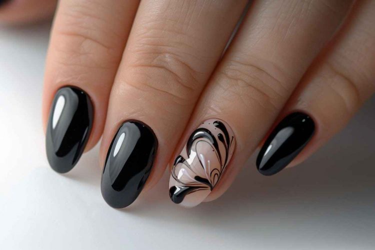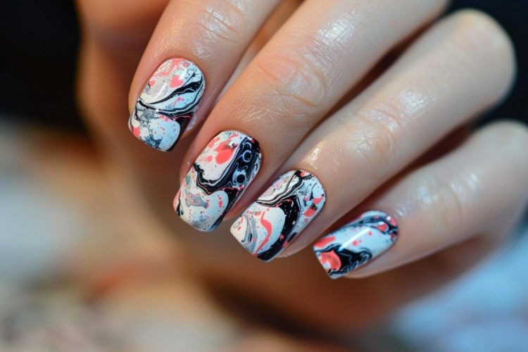 - Темні кольори теж можна використовувати на коротких нігтях. Головна умова – виграшно обіграти такі відтінки. Хорошим рішенням стане мармуровий нейл-арт із темною смарагдовою основою та світлими прожилками каменю.