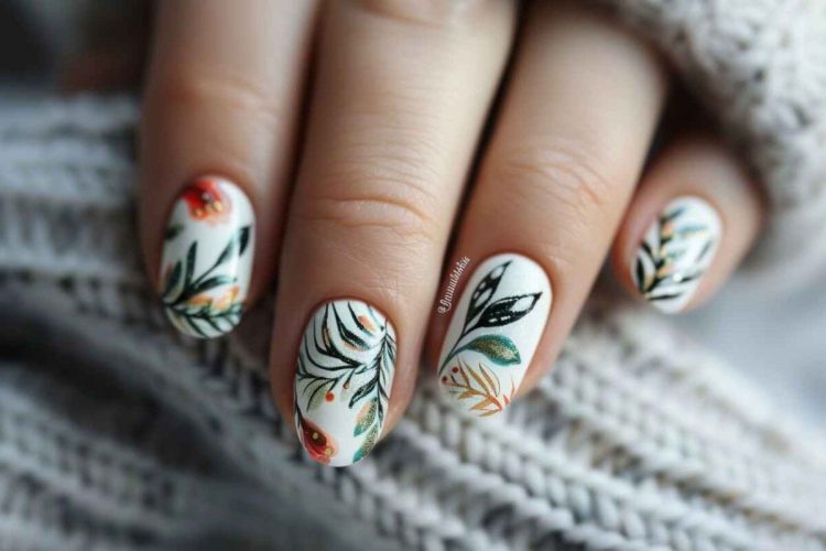 - Квіткові та ботанічні рослинні візерунки, які додатково підкреслять жіночність володарки такого нейл-арту. Головна умова – малюнок має бути витонченим. Від великих елементів краще утриматися, щоби не перевантажити нігті.