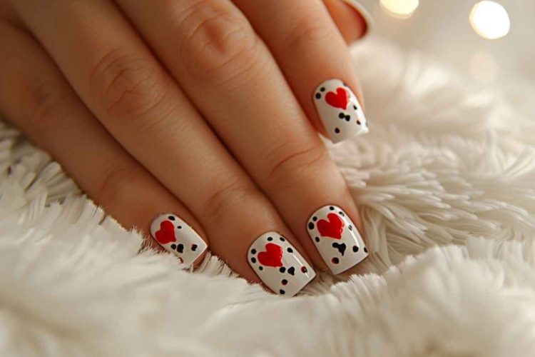 - Романтичний манікюр з серцями, які промальовуються пензлем або викладаються каміфубуками.