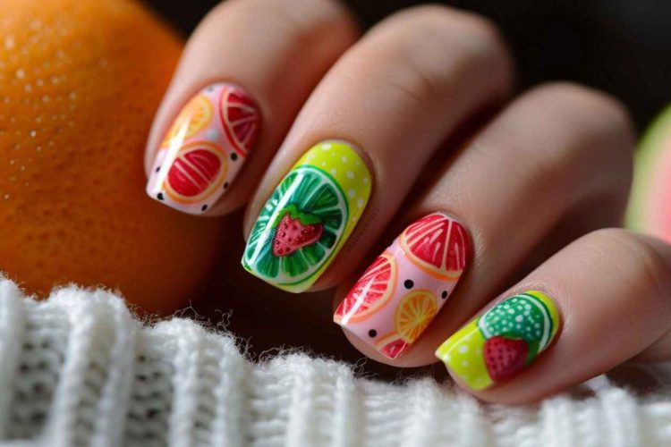 - Зображення фруктів – чудовий спосіб надати дизайну яскравості. Головна умова – такі малюнки мають бути мініатюрними та наноситися на нейтральне тло. Це зручно робити за допомогою готових наклейок.
