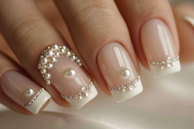 - Перлинний декор, що викликає асоціації зі стилем ретро. Для нього використовують білі або ніжно-рожеві намистини, що збігаються або відрізняються за розмірами. Їх рівномірно розподіляють по всій поверхні нігтя, щоб манікюр був максимально схожим на вінтажний гороховий принт.
