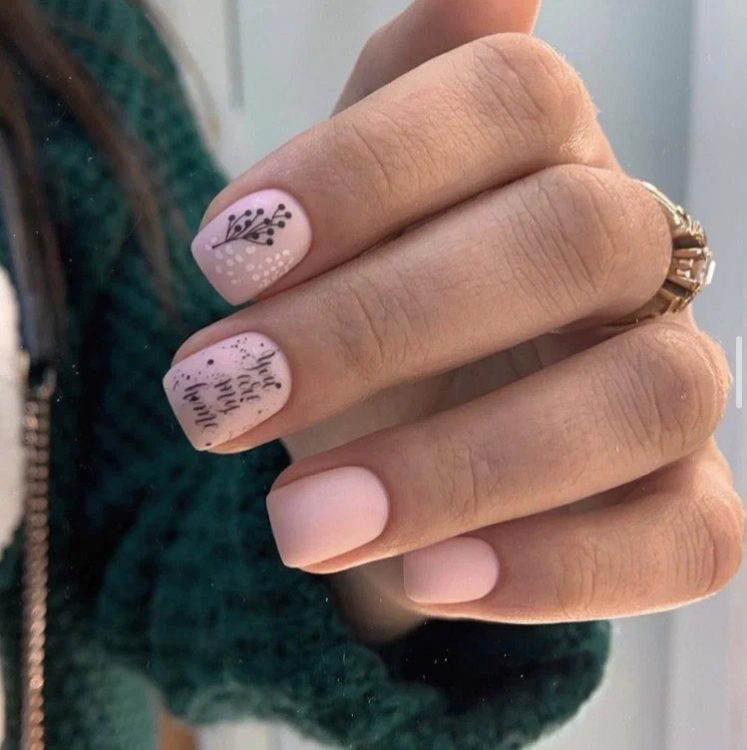 Квітковий принт та написи на пастельному покритті + матовий топ – модне весняне поєднання для коротких нігтів.