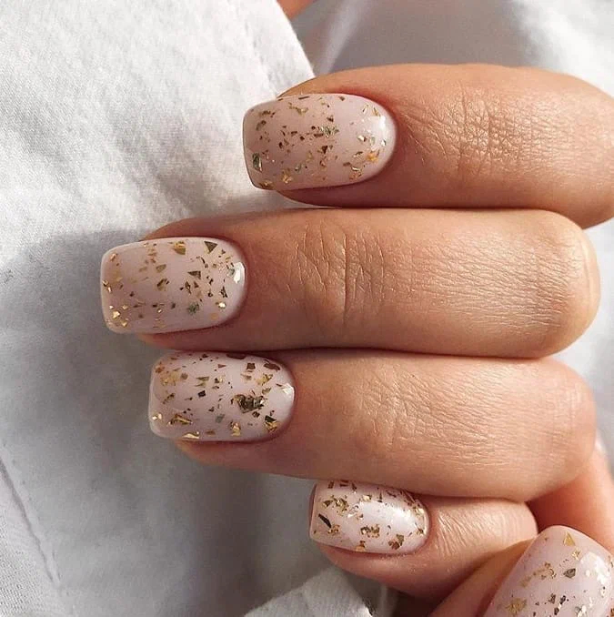 Манікюр з нюдовим покриттям та золотою поталлю виглядає святково та благородно. Експрес дизайн, який чудово виглядає у будь-яку пору року.