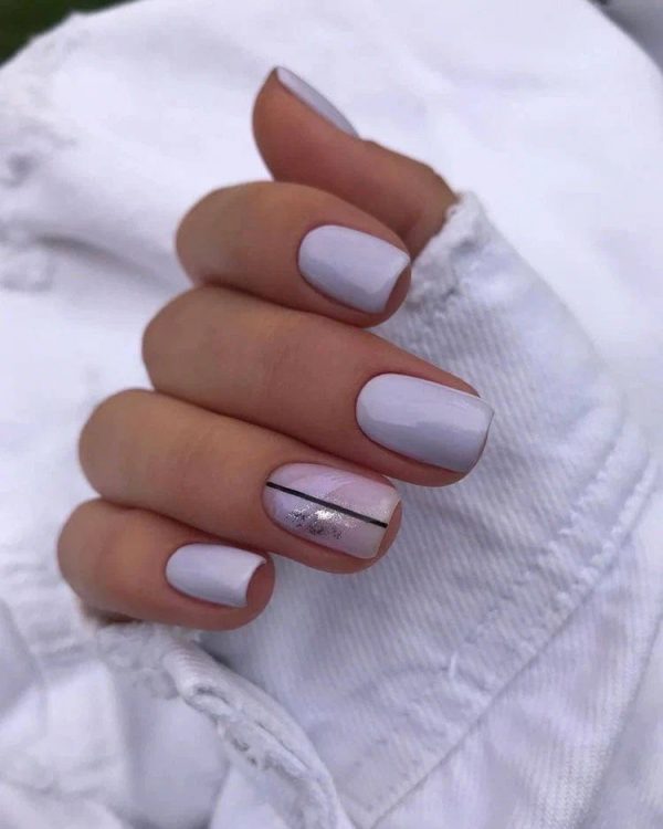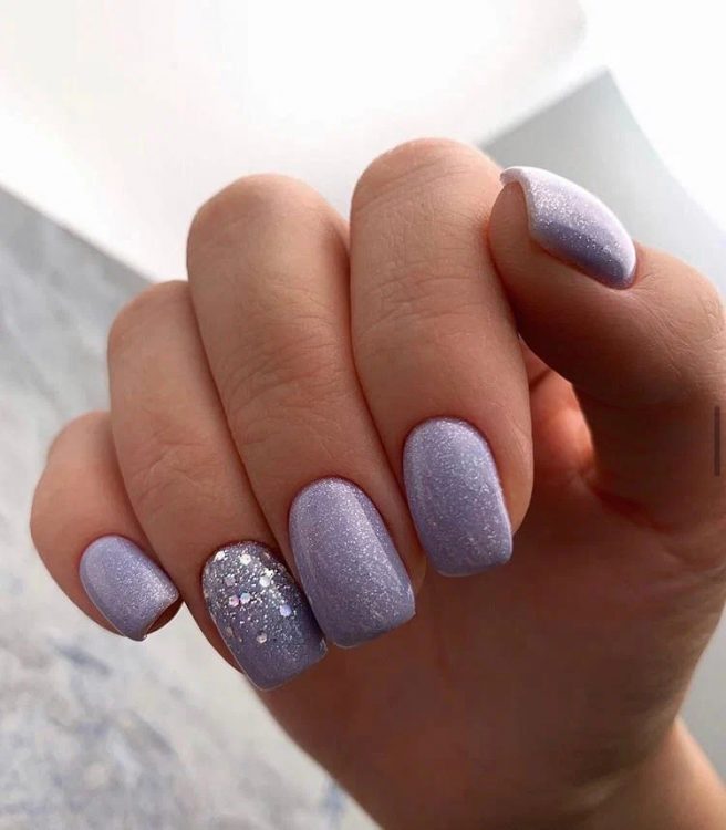 Привабливий лавандовий відтінок з мерехтливими частинками + безіменний ніготь з блискучим градієнтом – чудове поєднання для коротких нігтів.