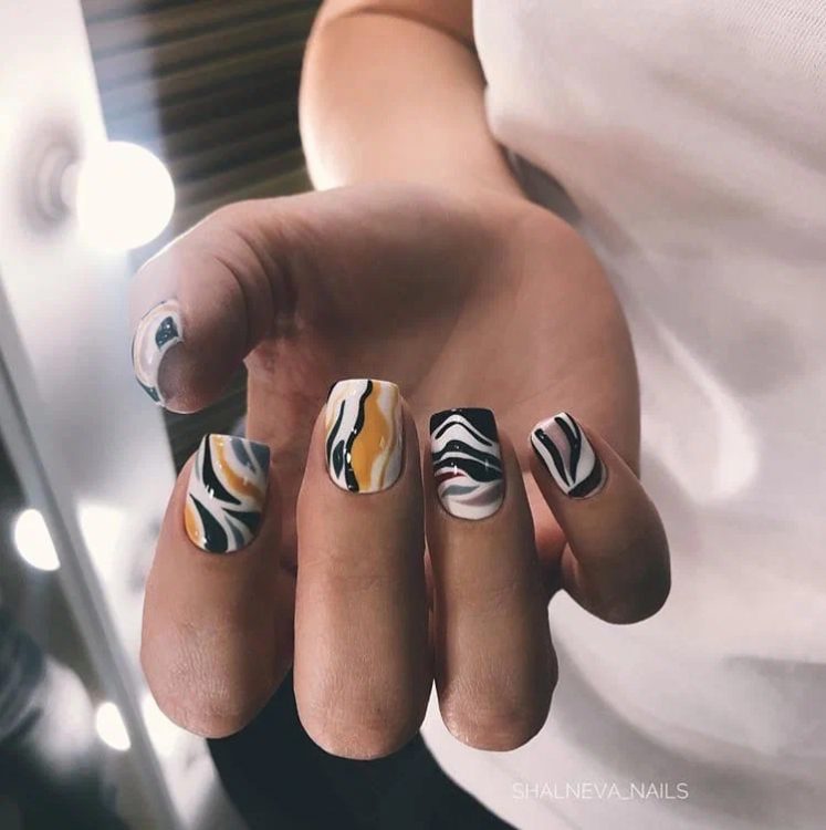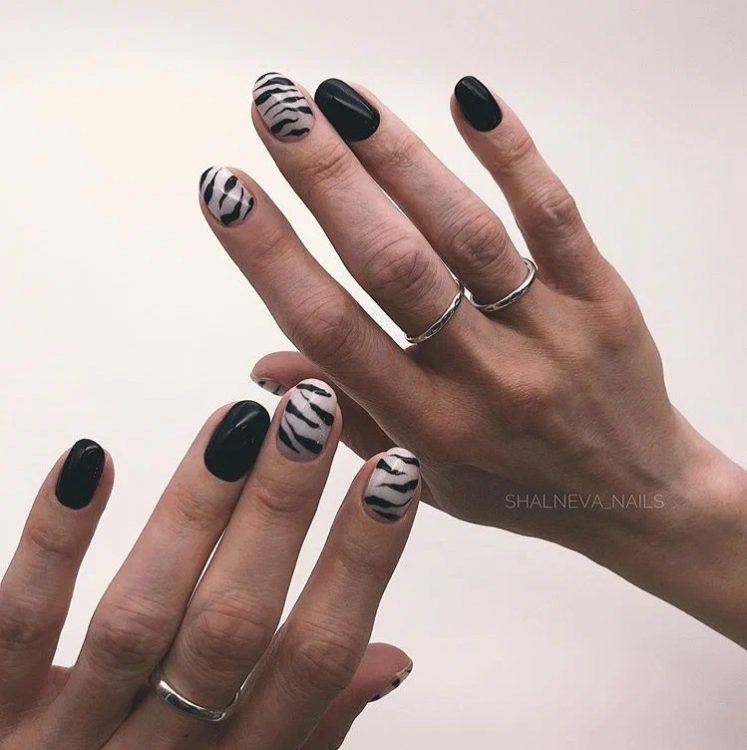 Чорний + молочна база + принт “зебра” з чорною промальовкою – ще один варіант манікюру, який прикрасить короткі нігті будь-якої форми.