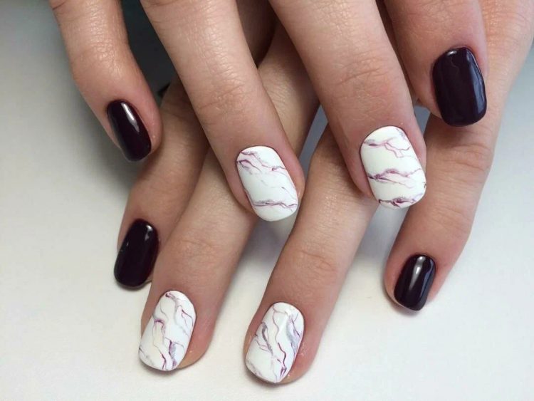 Чудово виглядає біло-сіра, біло-рожева або біло-блакитна гама. Такий манікюр виглядає чарівно і приковує увагу до нігтів. Але рекомендуємо все-таки зробити кілька мармурових акцентів, а решта нігтів нехай буде однотонною. Інакше вийде надто яскраво та заляпано.