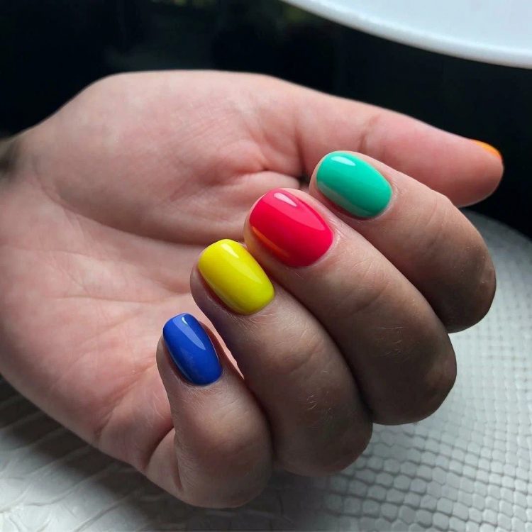 Різнокольорові нігті – справжній хіт літа 2022 року. Особливо вдало цей варіант підійде для яскравих та творчих натур, які ніяк не можуть визначитися із кольором лаку. Підберіть для кожного нігтя свій відтінок.