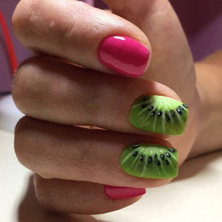 Створіть собі літній настрій вже зараз! Соковитий манікюр з малюнками ягід чи фруктів ідеально впишеться у повсякденний образ (тим, хто не має дрес-коду). Частинки кавунів, ягоди вишні, апельсини, яблука, полуниця, ананаси, персики, банани – виберіть свій улюблений фрукт і насолоджуйтесь дизайном.
