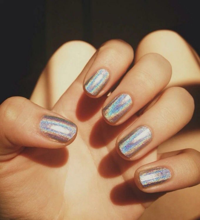 Хочете однотонне покриття, але щоб воно виглядали максимально ефектно? Тоді вам до стенду з лаком, що має голографічне сяйво. Воно виглядає чарівно, космічно і дуже привабливо.