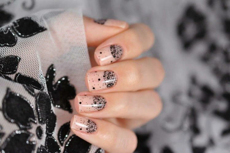 Виглядає дуже ніжно та повітряно. Як правило, для створення мереживного манікюру використовують наклейки або стемпінг. Ідеально такий дизайн виглядає на нюдових відтінках.