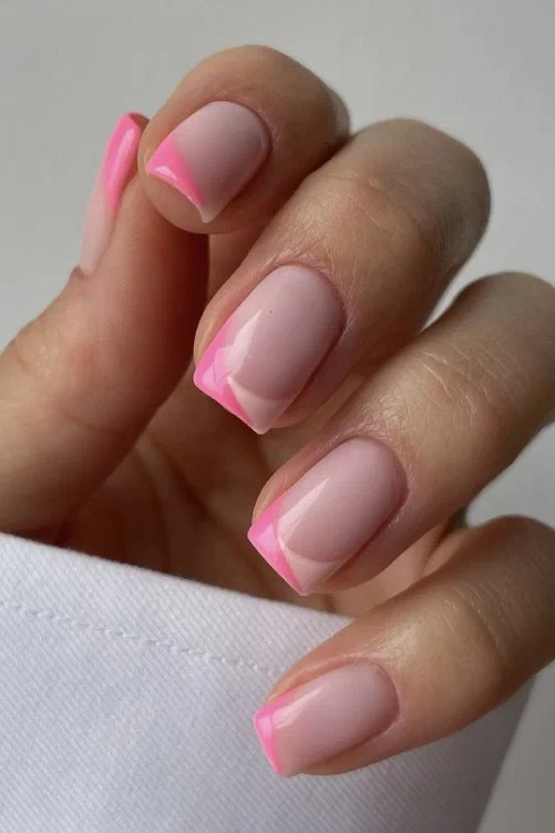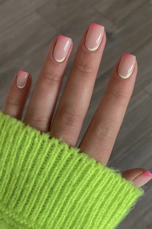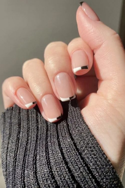 Французький манікюр з незвичайними геометричними лініями + два відтінки – складові модного дизайну для коротких нігтів квадратної форми.
