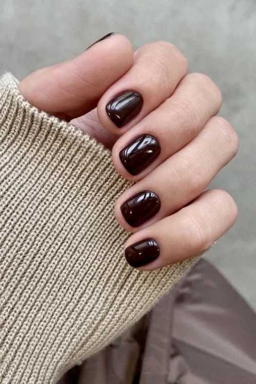 Однотонне покриття у відтінку “гарячий шоколад” просто створене для коротких нігтів. Для цього благородного відтінку підійде як матове, так і глянсове покриття.