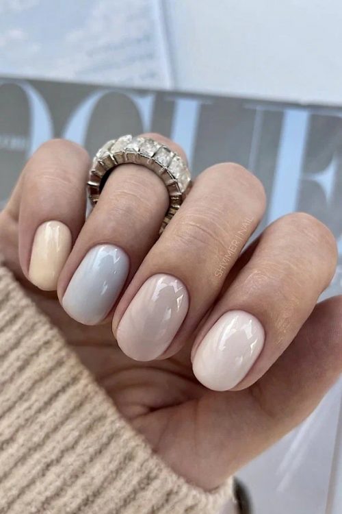 На коротких нігтях чудово виглядає райдужне покриття, виконане в пастельних відтінках.