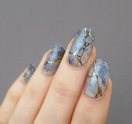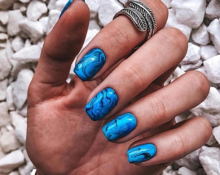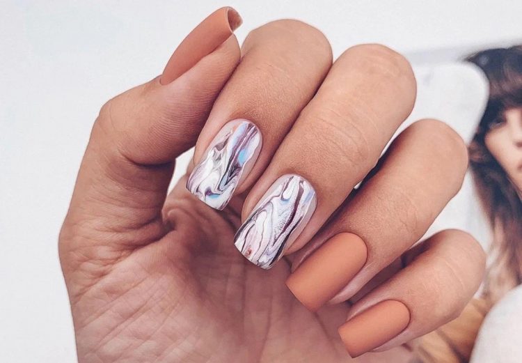 Мармуровий дизайн чудово виглядає на бежевому, коричневому, рожевому та сірому фоні, а якщо захочеться яскравості, можна додати на поверхню нігтя прожилки у золотому або срібному кольорі.