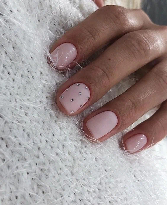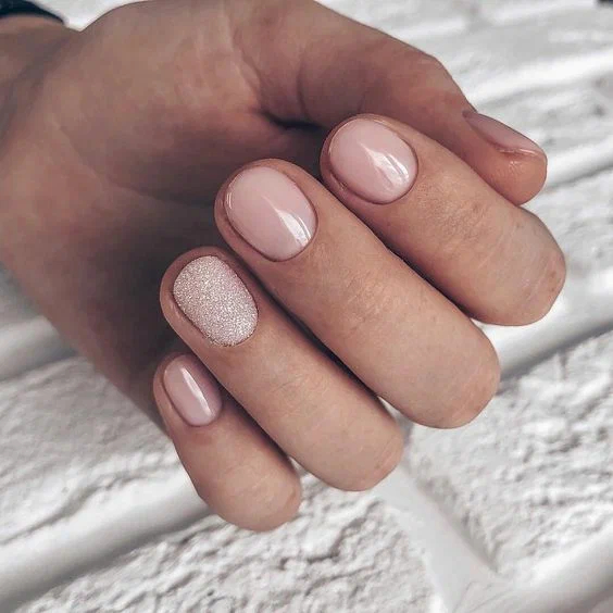 Короткі нігті круглої форми цього сезону можна прикрасити шикарним нюдовим кольором, а безіменний прикрасити блискучою присипкою, розсипом страз або фольгою.