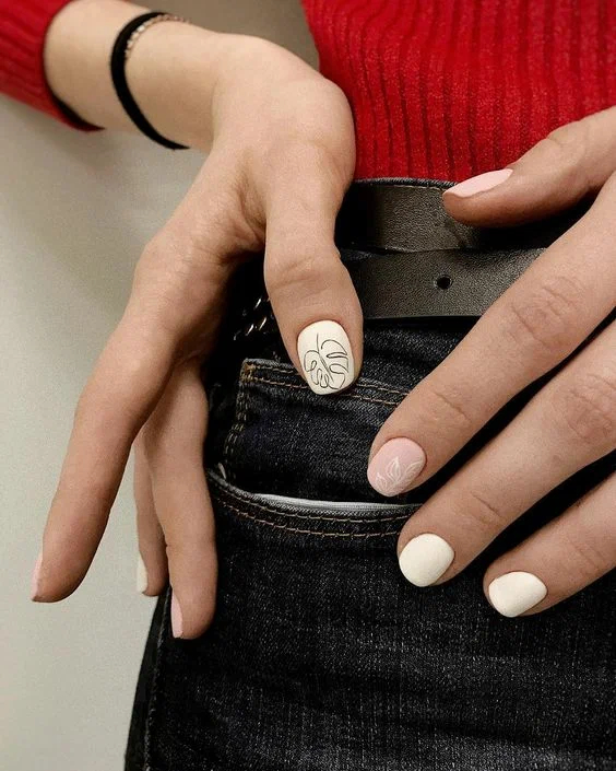 Матовий манікюр все також актуальний. На коротких нігтях ідеально виглядатимуть пастельні відтінки лаку, краще комбінувати відразу кілька, наприклад: білий та бежевий. Сучасності цьому «спокійному» манікюру додадуть виразні квіткові малюнки на нігтях. Тропічні листи або об’ємні букети півонії – ідеальний формат для весняно-літнього дизайну.