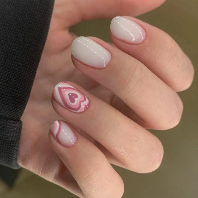 Чудовий спосіб оживити однотонний манікюр у бежевій або рожевій кольоровій гамі – це додати стильні серця.