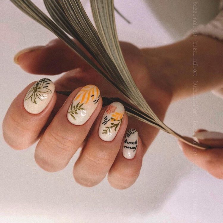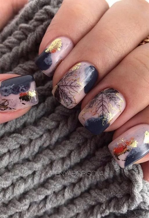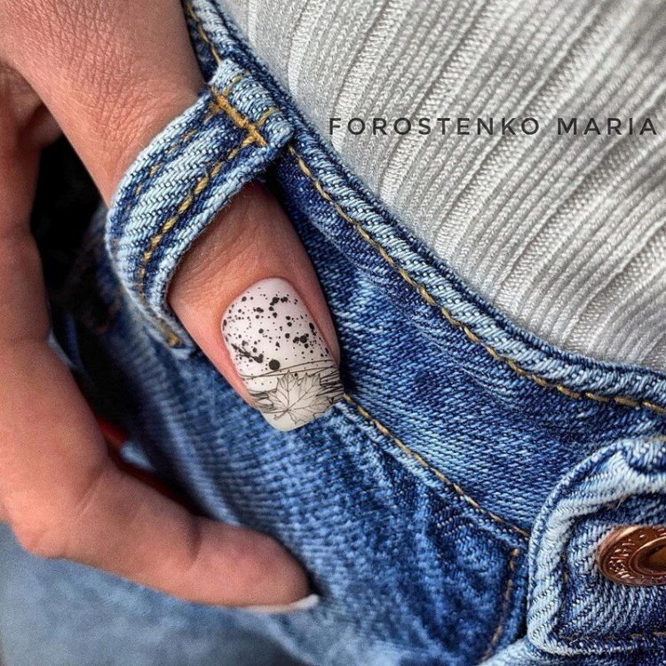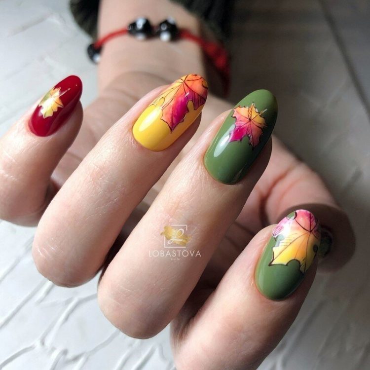 Листя – асоціюється з осіннім сезоном. Яскраве жовто-жовтогаряче листя клена буде чудовим акцентним малюнком у манікюрі на осінь. Додатковими елементами можуть стати крапельки води, бризки фарби, написи, павутинка та фольга в якості декору для малюнків листя на нігтях.