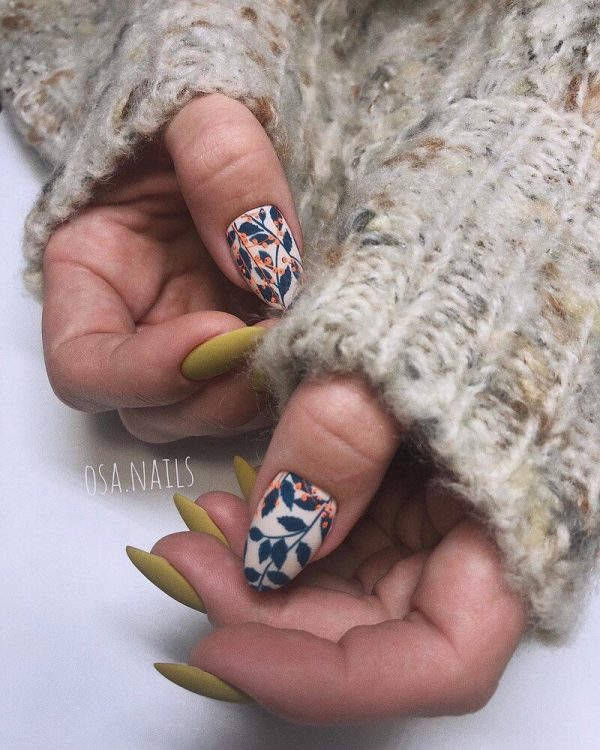 Гілочки є досить поширеним малюнком для нігтів, його можна використовувати цілий рік і в різних дизайнах, але в сезоні осінь-зима вони будуть особливо доречними. Посилити сезонний ефект осені та зими в манікюрі з гілочками допоможуть відтінки жовтого, помаранчевого, шоколадного, зеленого, гірчичного та інших кольорів, характерних для цієї пори року.