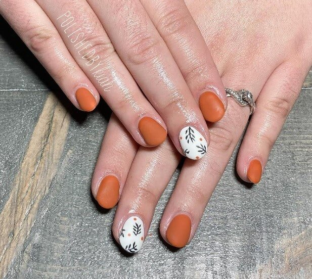 Помаранчевий матовий манікюр з білими акцентними нігтями